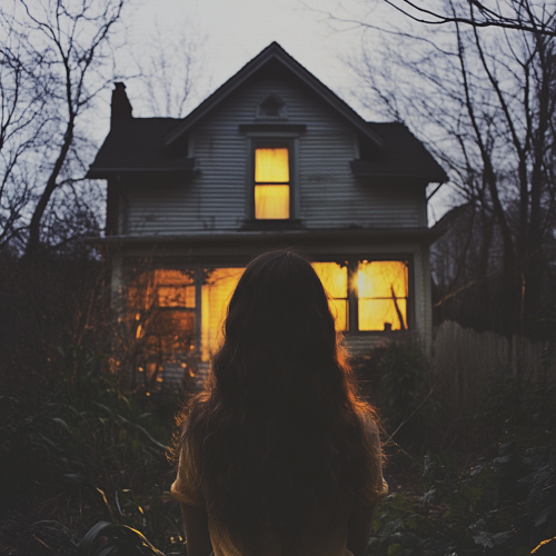 an old house on a dimly lit street at dusk with a teenage girl with long black brown wavy hair peaking through one of the windows. It will be the back of the girl with a focus on the house.