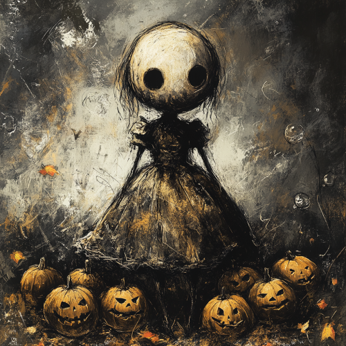 Illustrate a haunting figure holding a glowing jack-o'-lantern, dressed in a dark, Gothic-inspired outfit with intricate details, and wearing a wide-brimmed hat adorned with twisted branches. Use Edward Gorey's signature cross-hatching technique to create rich shadows and detailed textures, especially on the clothing and pumpkin, enhancing the eerie atmosphere. Design the character with a solemn, almost emotionless expression, with hollow, glowing eyes that convey a quiet menace. Keep the background minimal, using a subtle, misty darkness to focus attention on the figure and the glowing pumpkin. Add symbolic elements, such as faint skeletal or ghostly shapes, to evoke a mysterious and unsettling narrative.