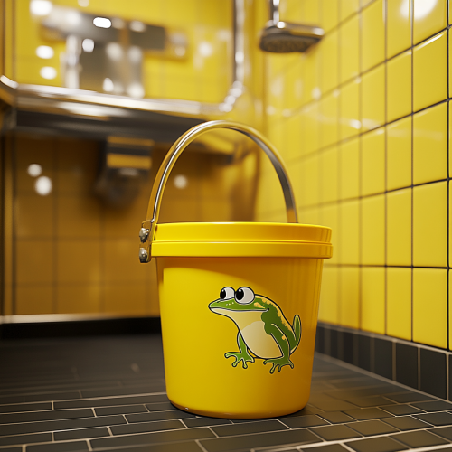 Realistic photo. A close-up of the very brightly lit washing area of a public bathhouse. There is a yellow pail under a beautiful high-tech faucet. The bucket has an illustration of a frog on it.