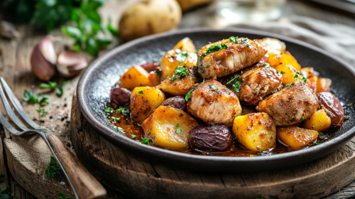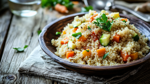 Realistic high-quality close-up of a beautifully plated dish of [nome della ricetta], captured in natural lighting. The dish is presented on a rustic wooden table with subtle, fresh ingredients scattered around as garnish. The food is warm, fresh, and inviting, with visible textures and vibrant colors. The setting includes small touches, like a folded napkin, silver cutlery, and a glass of water in the background, giving the scene a cozy, appetizing feel. Bol de bouddha : 100 g de quinoa, 150 g de légumes rôtis (carottes, courgettes), 50 g de pois chiches, arrosé d'une vinaigrette à base de 1 cuillère à soupe d'huile d'olive et de jus de citron. --ar 16:9