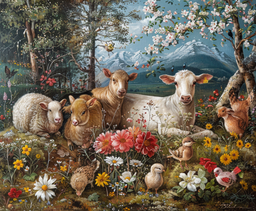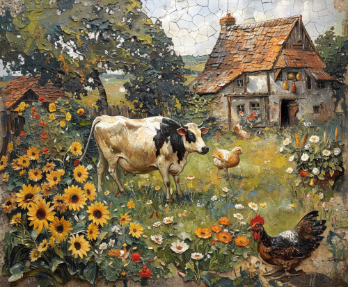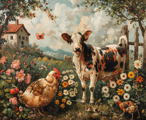 une image qui montre la basse-cour d'une ferme, avec une vache, une cochon, une poule et un coq, des chèvres et des lapins. Dans un style de peinture anïve --ar 6:5 --v 6.0 --s 250