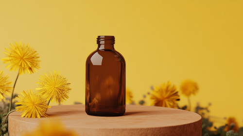 product photography, front view, yellow dandelion flowers in background, yellow background,brown colored bottle on product podium, hyperrealistic --ar 16:9