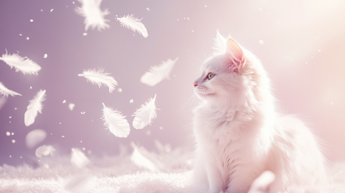 Beautiful calm white cat sitting surrounded by small white fluffy feathers, white feathers flying on the background, light purple background --ar 16:9