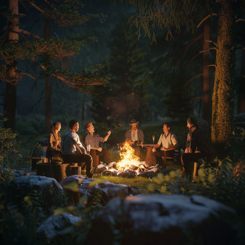 Corporate team gathered around a cozy bonfire in a forest clearing after an elegant dinner, soft ambient lighting, warm, inviting atmosphere, realistic photo, evening setting --v 6.0 --s 50