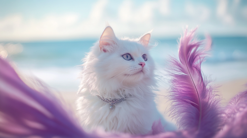 white longhaired furry cat with collar, extremely details, sharpen, white, lilac dramatic lighting, extremely detailed eyes, purple feathers blowing in the wind. beach with sand and blue sky in the background, purple and pink colors, full-body 85 mm photography --ar 16:9