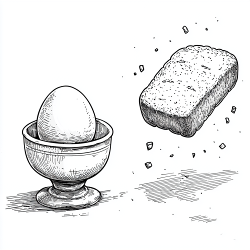 black an white vector colouring book style illustration of two items. an egg cup with an egg in it and a loaf of bread, falling from the sky. no background. on white background. no shading --s 250 --q 2