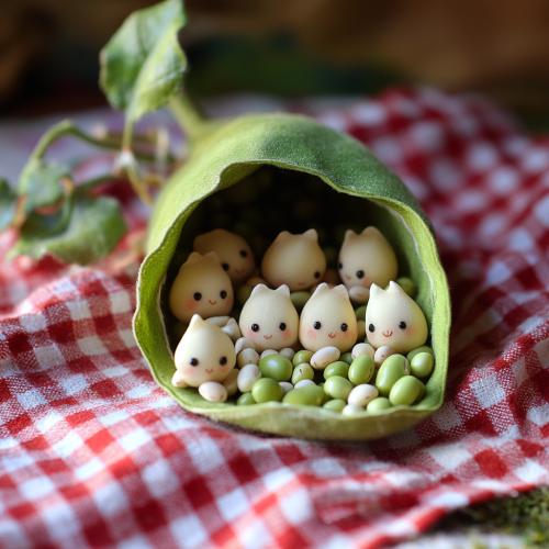 broad beans They look like little, plump, pale green and white beans. They're nestled snuggly together, some inside a long green pod, like a little bean-shaped house. The pod looks like it's almost bursting with yummy beans! The background is a pretty red and white checkered cloth, like a picnic blanket. It's a lovely, cozy scene, perfect for a cute little bean-themed photoshoot. Meow! So kawaii!