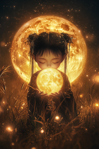Cute Chinese little girl baby chibi style surrealism art style,Holds the yellow glowing big full moon in hands,Beautiful idyllic meadow with tall grass and fireflies,Anime,Chibi,Kawaii,The image is very warm,soft,romantic and Festive,Extremely detailed 3D animations,Shiny snow white fluffy ,Dark soulful eyes,Natural light,Unreal Engine,Octane rendering,Depth of field --ar 2:3 --p ie82c22 --v 6.1