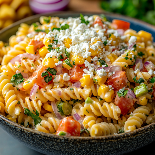 A close-up of a vibrant bowl of Mexican Street Corn Pasta Salad. The salad features rotini pasta mixed with sweet corn, diced tomatoes, chopped red onion, fresh cilantro, and a creamy dressing made from mayonnaise and sour cream. Crumbled cotija cheese is sprinkled on top for an authentic touch, with a mix of bright colors from fresh vegetables like green bell peppers and tomatoes. A small assortment of ingredients on the side shows the preparation elements. Natural lighting, with a fresh and appetizing look that highlights each ingredient's texture and color