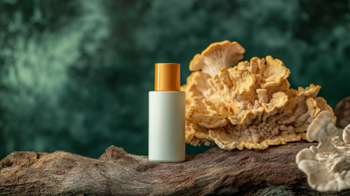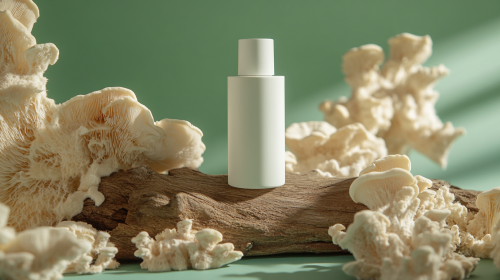 quarter angle view of a cosmetic bottles playfully sitting on a piece of wood on a clean green backdrop. cordyceps maitake chaga lion's mane mushrooms grow up around it. --ar 16:9