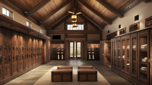 Interior of converted cabin clubhouse, spacious locker rooms with wooden accents, Colorado ski resort style, warm lighting, high ceilings, architectural visualization --v 6.1 --ar 16:9
