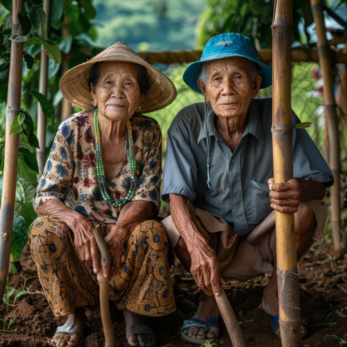A candid photograph of two elderly Cambodian farmers in a lush Kampot pepper plantation. The elderly woman is seated on the soil, wearing traditional patterned clothes and a straw hat, while the man stands beside her, holding a sturdy wooden staff, and wearing a casual shirt and blue bucket hat. Both show the weathered lines of experience and resilience on their faces. The background features tall pepper vines growing on wooden poles under a protective green netting, with soft natural sunlight filtering through. The overall atmosphere conveys hard work, tradition, and a deep connection to the land. Created Using: documentary photography, warm natural lighting, candid framing, rich textures, hd quality, vivid details --ar 1:1 --v 6.0 --s 250
