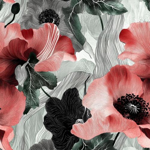closeup seamless floral pattern. consisting of: poppies and leaves. basic delicate colors: red, black, green. the drawing has an abstract shape, fancy curls, and splashes of white outline. The drawing is made in watercolor. Special attention is paid to details, the drawing should look expensive. reminiscent of Jiang Debin style. silk texture. --tile --v 6.1