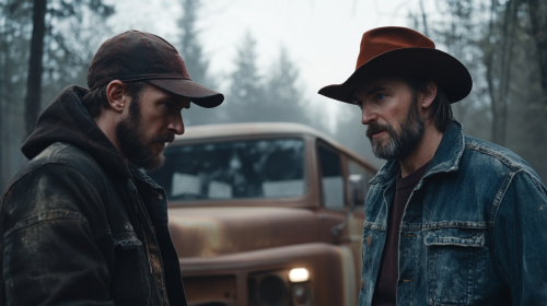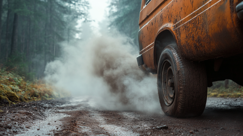 Close-up of the rusted exhaust pipe of the old van, shaking slightly as thick, gray smoke begins to pour out. The van’s rusty, weathered surface contrasts with the fresh, damp forest floor beneath it. Mist swirls around the tires as the smoke blends into the foggy air, enhancing the eerie and mysterious atmosphere of the isolated forest road. --v 6.1 --ar 16:9