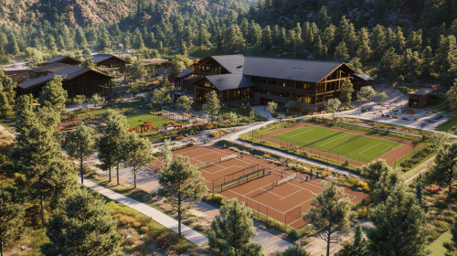 Aerial view of mountain resort complex, 3 pickleball courts, soccer field, and children's play area nestled in pine forest, cascading terrain, photorealistic render --v 6.1 --ar 16:9
