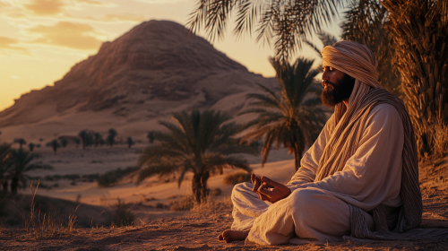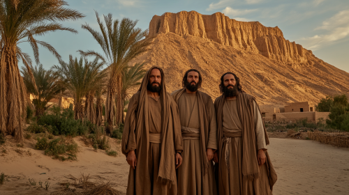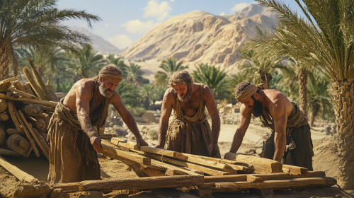 photo of the Prophet Noah and his 3 sons doing construction work with wood, Noah is an older man, hos sons are mid aged adults and strong in stature, 2000 BC, in the desert, palm trees, a sand mountain in the background, 35mm, natural colors, canon R5, realsitic, --ar 16:9