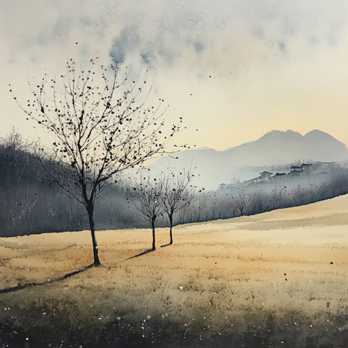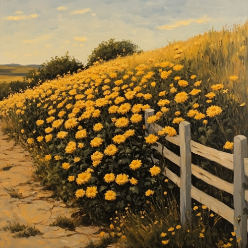 Impressionism style painting of land, As I pick chrysanthemums beneath the eastern fence ,embodies the qualities of soft, fertile soil that nurtures and nourishes life. It resonates with the Yin aspect of the Earth element.