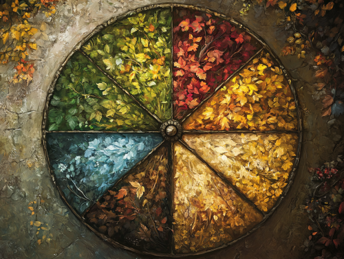 A wheel representing the changing of the seasons. The wheel has 4 sections. One has deep greens, another golden browns, another is barren and cold, and the last is vivid light green. Fantasy RPG setting. --ar 4:3 --v 6.1
