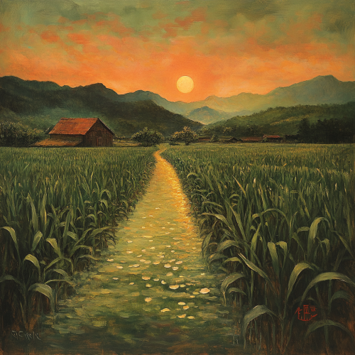 Farm land oil painting,Ji Earth embodies the qualities of soft, fertile soil that nurtures and nourishes life. It resonates with the Yin aspect of the Earth element.