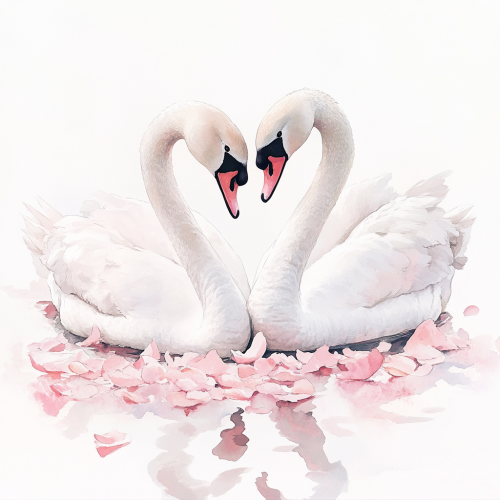 highly detailed watercolor clipart of two beautiful white swans, floating on the surface, on the surface light pastel pink petals, the swans facing each other and forming a heart shape, soft colors, romantic style, beautiful illustration with realistic details, luxury aesthetic, high definition, white background