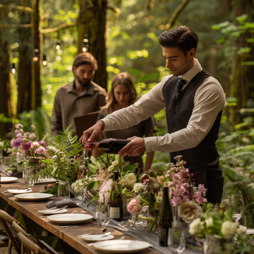 Waitstaff pouring wine or cocktails for corporate guests at a woodland dinner table, beautifully set with floral decor, soft natural lighting, lush forest backdrop, realistic photo --v 6.0 --s 50