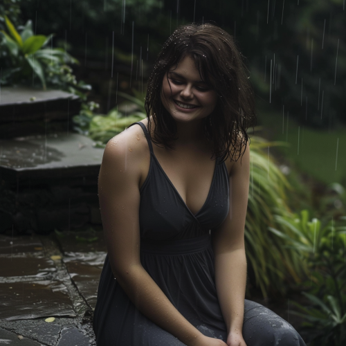 Close-up of a guest in a contemplative moment, enjoying nature at an outdoor dinner table, blurred forest backdrop, elegant decor, natural lighting, peaceful, realistic photo --v 6.0 --s 50