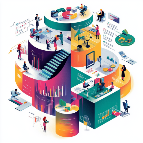 Create an illustration that visually categorizes tasks into three distinct sections: core tasks, strategic outsourcing tasks, and commodity outsourced tasks. The core tasks section should be central and prominent, depicted with vibrant colors and detailed imagery to signify importance. Illustrate employees engaged in dynamic activities like analyzing data, making decisions, and networking within the company. Surround this central section with two other sections: strategic outsourcing tasks and commodity outsourced tasks. Use slightly muted colors for these sections to indicate their supportive roles. Strategic outsourcing can show collaboration with external experts, while commodity outsourcing can depict routine, automated tasks. The overall style should be professional and modern, akin to illustrations found in business strategy reports or high-end corporate presentations. Think of the clean, informative visuals seen in Harvard Business Review or Forbes articles