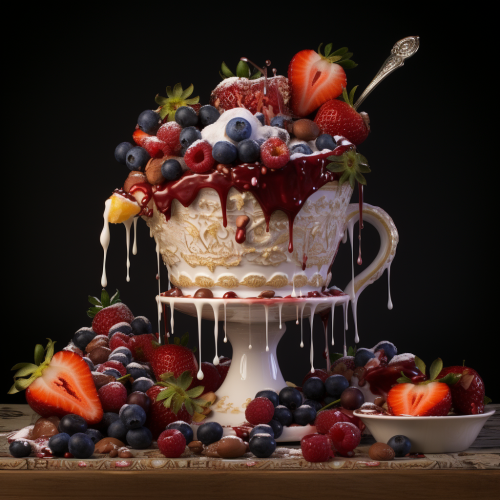 Uma taça grande, dentro da taça tem uma barra de chocolate e 2 morangos e uvas e um favo de mel