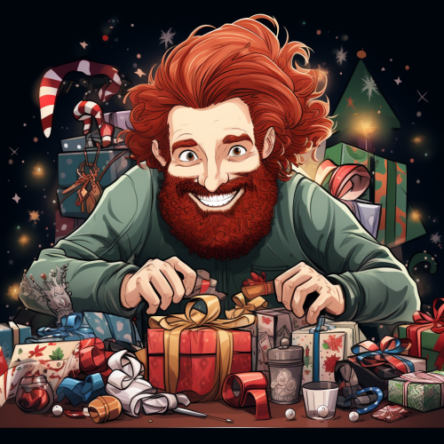 a red-haired guy with gathered hair and a beard with a funny facial expression is very quickly wrapping presents for the new year. there should be a new year's mess around him