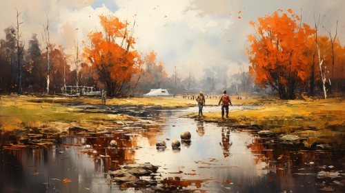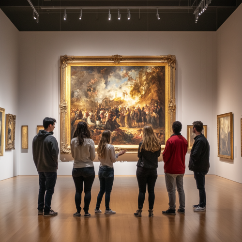 An elegant museum setting with a small group of people standing in front of a large, captivating painting, engaged in deep discussion as part of an interactive art appreciation session. The soft lighting in the gallery highlights the artwork and the thoughtful expressions on the participants' faces as they exchange ideas and insights. Some individuals gesture gently towards the painting, while others listen attentively, creating a scene of mutual engagement and intellectual exchange. The museum’s spacious, quiet environment with polished wooden floors and high ceilings enhances the atmosphere of focus and reflection. In the background, additional paintings and sculptures are subtly illuminated, adding to the cultured, contemplative mood of the space. The overall scene captures a sense of curiosity, learning, and shared discovery in the context of art appreciation.