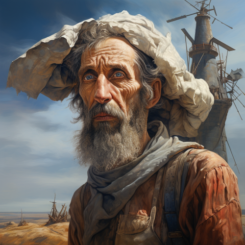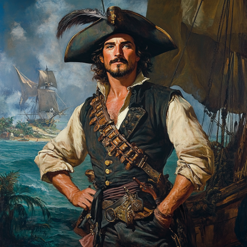 A striking 1700s-era oil painting of Jean Lafitte, the infamous French pirate smuggler, standing confidently at the helm of his sleek ship, navigating through hidden trade routes in the Gulf of Mexico. Lafitte is dressed in a stylish yet rugged pirate ensemble, featuring a dark waistcoat, a wide-brimmed hat with a feather, and a bandolier filled with pistols. His sharp, clever eyes scan the horizon as he steers his ship through treacherous waters. Behind him, a coastline filled with secret coves and dense mangroves serves as a reminder of his mastery in evading authorities. The crew in the background loads contraband, while the ship’s sails billow in the breeze. The palette features rich, earthy tones of green, brown, and deep blue, reflecting both the natural landscape and Lafitte’s stealthy, strategic nature, with flashes of silver and gold suggesting the wealth from his successful smuggling operations.