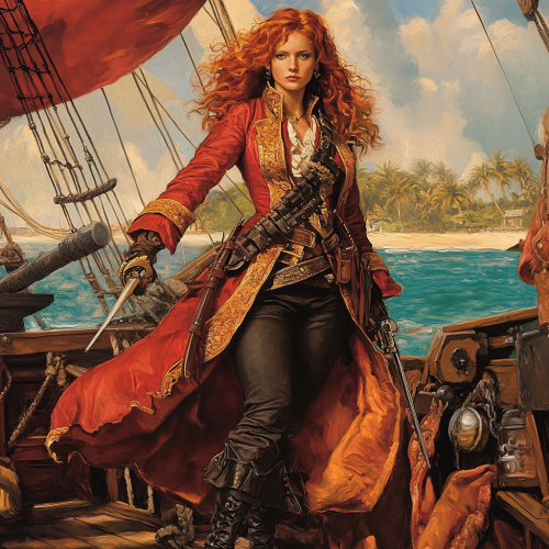 a vibrant 1700s-era oil painting depicting Anne Bonny, the legendary female pirate, standing confidently on the deck of a pirate ship. She is dressed in a combination of rugged pirate gear and feminine touches, such as a long, flowing red coat with gold embroidery, tall black boots, and a sword strapped to her side. Her fiery red hair flows in the wind, and her piercing gaze exudes both fearlessness and cunning. She stands with one foot on a barrel, holding a pistol in one hand and a cutlass in the other, ready for action. The backdrop shows a sun-soaked Caribbean island with palm trees and clear blue waters, while her ship’s crew readies for battle under a pirate flag. The sky is a blend of golden hues, capturing the moment before an impending storm or raid. The colors are rich and dynamic, with reds, golds, and deep blues highlighting Anne’s commanding presence as a legendary pirate.