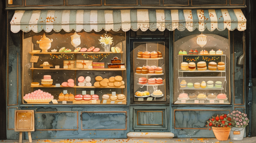 A 2D gouache painting of a Parisian bakery front facade, with windows full of cakes, colorful macarons, croissants, canelés, madeleines, pain au chocolat, warm and cozy colors, simple design, minimalistic approach, soft brush strokes, inviting feel, hd quality, gouache texture, inspired by French patisseries, --ar 16:9 --v 6.0