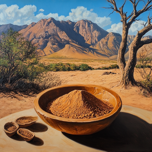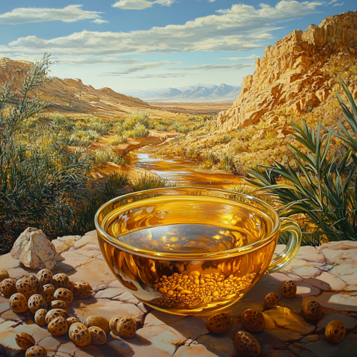 a painting of a argon oil (aka liquid gold) in ancient south africa. it is glistening because of how healthy it is. it is in a beautiful south african environment