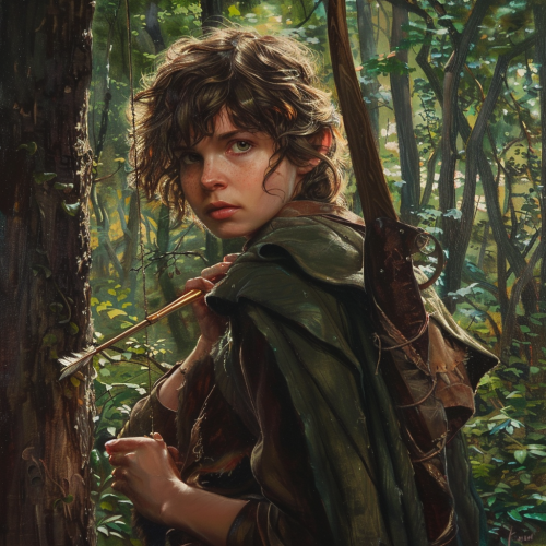 a lord of the rings, hobbit girl with a bow and short curly hair, short hair, short hair in a green cloak watching some bandits go by in a forest, wide shot, portrait, full body, hiding behind a tree, fantasy art oil painting --v 6.0