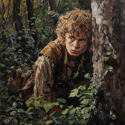 a lord of the rings, hobbit with a watching bandits go by in a forest, and short blonde curly hair, short hair, short hair, in hobbit clothes watching some bandits go by in hobbiton, wide shot, portrait, full body, hiding behind a bush, fantasy art oil painting --v 6.0 --iw .5