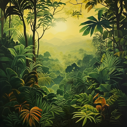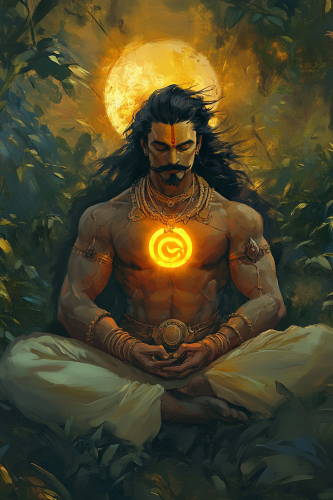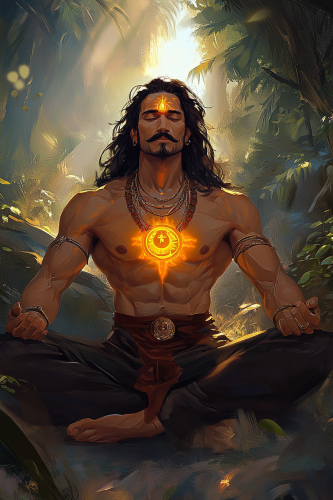 an oil painting, illustration, mahabharat character surya putra karna with mustache and long hair and heavy body, with a yellow glowing sun symbol in the middle of chest, sitting in a jungle and doing meditation in windy air, sun in a background --ar 2:3