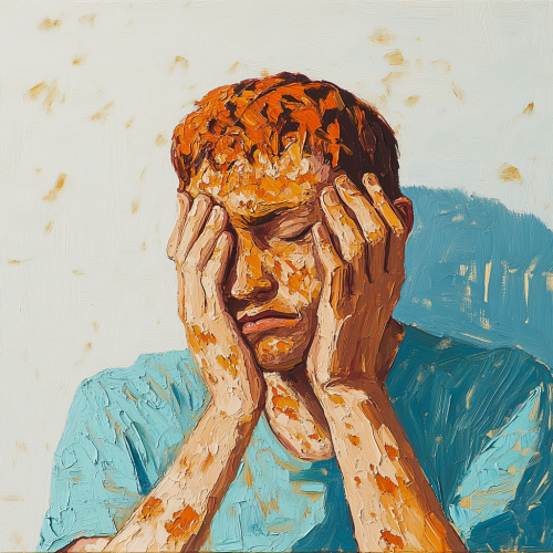 an oil painting, illustration, characature of person looking dejected, examining their skin covered with eczema rashes. Use branding colors F6983D as main background