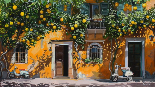 A 2D gouache painting of the front facade of a charming Sorrento house, surrounded by lush lemon trees framing the windows, a classic Vespa motorcycle parked in front, bright daylight, rustic walls, intricate details on windows and doors, warm Mediterranean colors, hd quality, handmade look, inspired by Italian streetscapes, --ar 16:9 --v 6.0