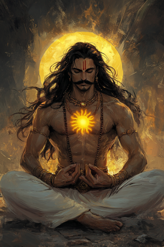 an oil painting, illustration, mahabharat character surya putra karna with mustache and long hair and heavy body, with a yellow glowing sun symbol in the middle of chest, sitting on ground and doing meditation in windy air, sun in a background --ar 2:3