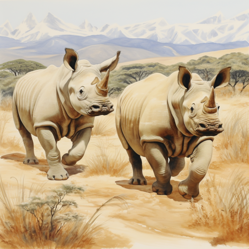 rhinos running in the African savannah in the style of Japanese painting fabric