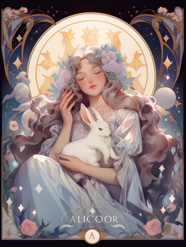 alfons maria mucha, rococo, oil painting style, tarrot cards, art nouveau, a queen holding a white rabbit, looking at camera, the moon and the stars, iridescence, picture books, gold, glitter, roses, amethyst, gorgeous, high detail. --ar 3:4 --niji 5