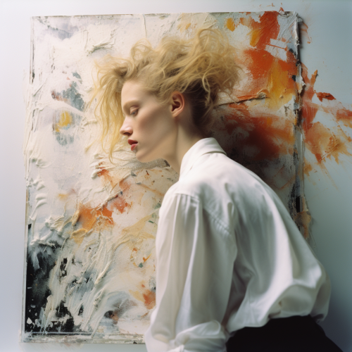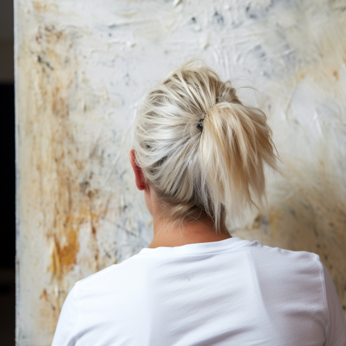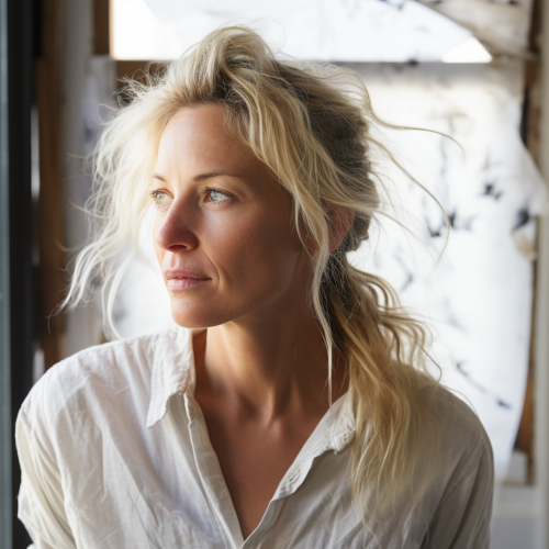 a photo-realistic close up image of a 45 year old female artist looking at her canvas. She is wearing a white cotten shirt spattered with flecks of paint. Her hair is blonde with hints of grey. She is softly lit from a large window above her. Her artist loft is a messy working space with white walls and other paintings in the background. Extreme shallow depth of field. Her expression is hopeful as she looks directly at the blank canvas in front of her.