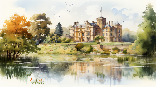 A beautiful church similar to Lyme Park in Cheshire, England, in a watercolor style, soft colors, no frame, romantic --ar 16:9 --style raw --s 250