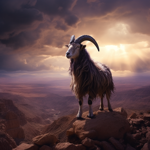 Botticelli's painting style, goat looking over a rocky cliff desert ancient Israel, cinematic, ultra-detailed, perfect composition, moody lighting, 4k, purple and blue tones, dust, Mysterious, emotional, long wide shot, big cloudy sky