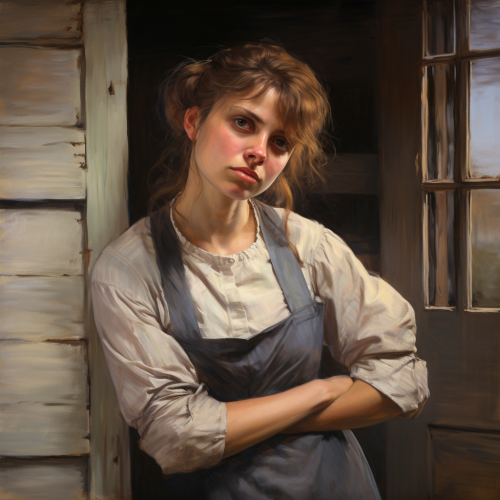 A bold 1700s-era oil painting of Henrietta, the no-nonsense quartermaster of a pirate ship, standing in the ship's hold, surrounded by crates of supplies, barrels of rum, and weapons. Henrietta is a powerful figure, dressed in simple yet practical attire, with a long leather coat and a wide belt lined with keys, tools, and a pistol. Her stern, determined expression commands respect, and she holds a ledger in one hand, marking inventory, while her other hand rests on a cutlass strapped to her side. The dimly lit hold is illuminated by lantern light, casting shadows that highlight her imposing presence. In the background, crew members haul supplies under her watchful eye. The scene is painted in rich tones of dark brown, gold, and deep green, emphasizing the gritty, hardworking atmosphere of the pirate life, with Henrietta as its disciplined and formidable leader.