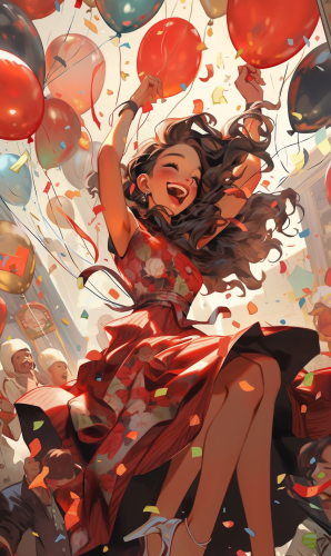 A gorgeous woman jumping out of a big birthday cake, balloons and confetti, celebration , bold colors, brushwork and airbrush, J. C. Leyendecker, i shuxing, multiple flash, expressive and cute, --ar 3:5 --s 200 --niji 5