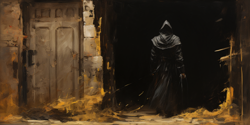 Style of Medieval Bold brush stroke acrylic painting ,a black hooded man peeping though the destroyed door, destroyed wooden door --ar 2:1