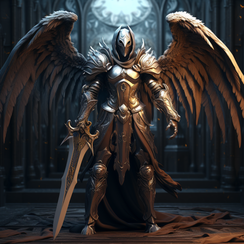 grim angel knight on guard holding one sword, high fantasy, digital art, masterpiece painting, ultra detailed, ultra high definition, 8K resolution, 3D shading, superior quality, cover illustration, complex design, fang amulets highlights, deep rich vibrant colours, hyperrealistic, meticulously hyper detailed, artstation
