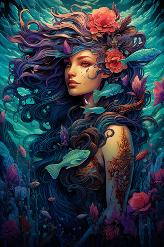 a beautiful painting , mermaid, balinese, hindu, eastern art, in the style of dan mumford, richard doyle, robert crowley, henri le fauconnier, in the style of lush and detailed, in the style of vibrant illustrations, neon art nouveau, uhd image, whimsical illustrations, low resolution, glowing lights, fairycore, enchanting, cyan, 8k resolution,atmospheric woodland imagery, luminescent color scheme, in the style of psychedelic artwork, gorgeous colors, romanticized nature, threaded tapestries, i can't believe how beautiful this is, in the style of psychedelic art, vibrant tapestries, contrasting lights and darks, dark cyan and purple --ar 2:3